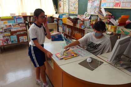 図書システム用のパソコンを操作して、貸し出しや返却の手続きの仕事をする図書委員です。