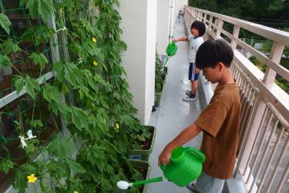 4年生の育てているツルレイシ(ゴーヤ)に水やりをしているところです。