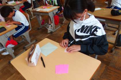 タブレットからスクリーンに映し出される動画を見ながら折り紙を折っていました。