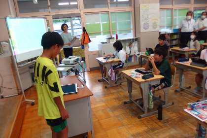 7月13日の東広瀬小学校(32) 公開日 2023/07/18 更新日 2023/07/18 活動の様子 5年生の英語の授業です。 5年生になってからの4か月間の復習で、自己紹介スピーチをしました。 参考になるようにタブレットに英文や写真をまとめ、紹介しながらスピーチを進めました。