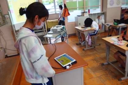 7月13日の東広瀬小学校(39) 公開日 2023/07/18 更新日 2023/07/18 活動の様子 5年生の英語の授業です。 5年生になってからの4か月間の復習で、自己紹介スピーチをしました。 参考になるようにタブレットに英文や写真をまとめ、紹介しながらスピーチを進めました。