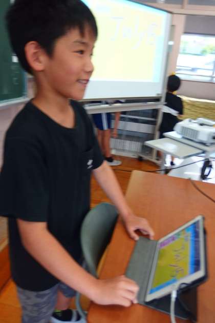 7月13日の東広瀬小学校(45) 公開日 2023/07/18 更新日 2023/07/18 活動の様子 5年生の英語の授業です。 5年生になってからの4か月間の復習で、自己紹介スピーチをしました。 参考になるようにタブレットに英文や写真をまとめ、紹介しながらスピーチを進めました。
