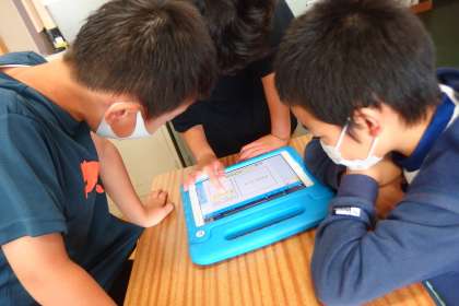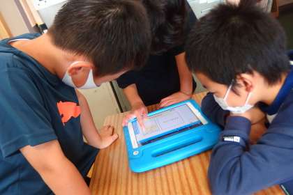 タブレットを上手に使いこなしながら、2年生が4年生にインタビューをしています。