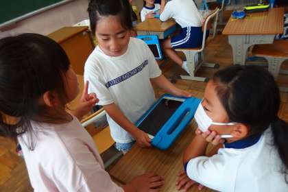 タブレットを上手に使いこなしながら、2年生が4年生にインタビューをしています。