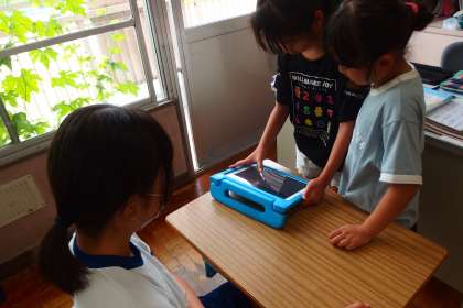 タブレットを上手に使いこなしながら、2年生が4年生にインタビューをしています。