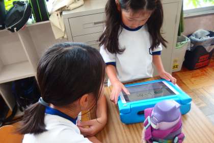 タブレットを上手に使いこなしながら、2年生が4年生にインタビューをしています。