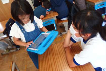 タブレットを上手に使いこなしながら、2年生が4年生にインタビューをしています。