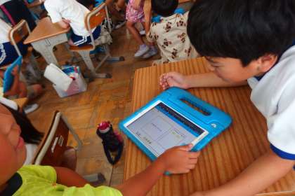 タブレットを上手に使いこなしながら、2年生が4年生にインタビューをしています。
