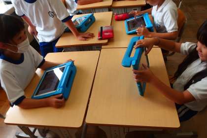 矢作川のアユについてタブレットにまとめたことをペアやグループで発表し合っていました。