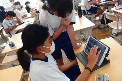 タブレットに修学旅行の目的地である奈良、京都のことをまとめているところです。