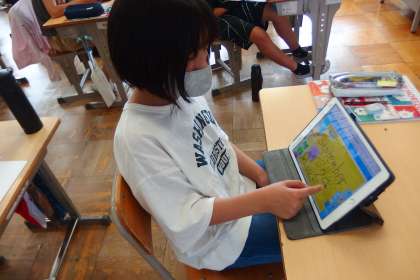 5年生の英語の授業です。 英語での発表原稿をまとめたタブレットを確認しているところです。