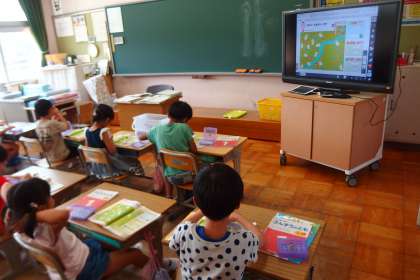 1年生の算数の授業です。 電子黒板に映っているのはデジタル教科書の問題です。