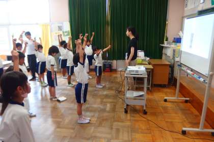 ラジオ体操の動画をタブレットからスクリーンに映してお手本にしていました。