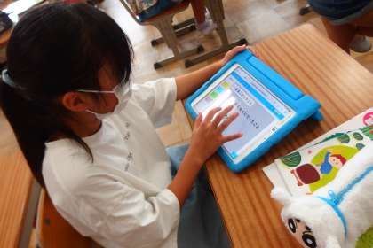 わかばタイムの4年生です。 タブレットを使っての外国語活動の学習です。