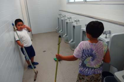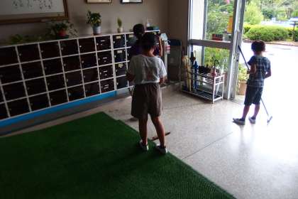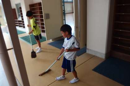 ファミリー清掃の様子です。 縦割りのそうじは、低学年と高学年が支え合う学び合いの活動です。
