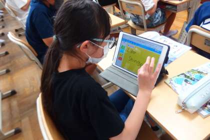 動詞の過去形を使って夏休みの思い出を英文にして、タブレットにまとめているところです。