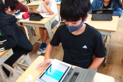 動詞の過去形を使って夏休みの思い出を英文にして、タブレットにまとめているところです。