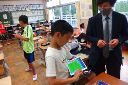 9月6日の東広瀬小学校(57) 公開日 2023/09/13 更新日 2023/09/13 活動の様子 5年生の英語の授業です。 夏休みの思い出を英文にするときに、形容詞を使って感想を表現したものを、タブレットにまとめました。 それを見せて助けにしながら、ALTと英会話をしています。