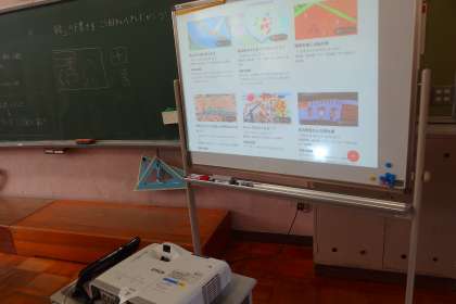 3年生の図工の授業です。 参考資料をタブレットから提示しています。