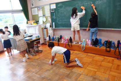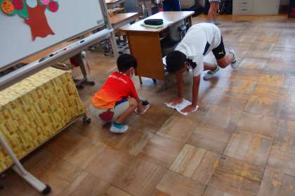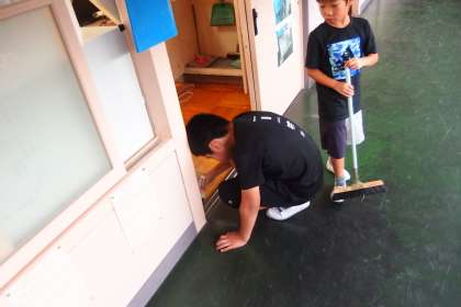 ファミリー清掃の様子です。 縦割りのそうじは、低学年と高学年が支え合う学び合いの活動です。