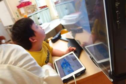 タブレットから3年生の水彩画作品を映し出して参考にしています。