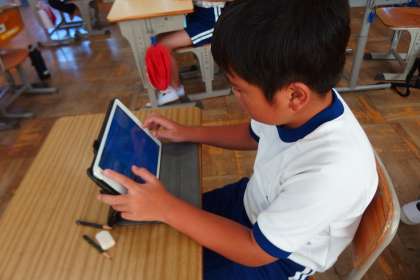タブレットのアプリで復習をしている5年生です。