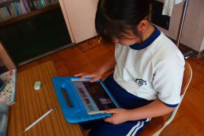タブレットのアプリで復習をしている4年生です。