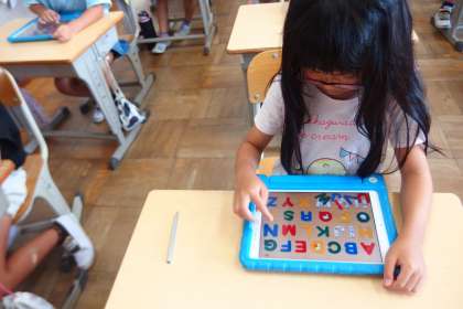 タブレットのアプリでアルファベットの学習をしているところです。
