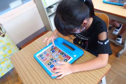 タブレットのアプリでアルファベットの学習をしているところです。