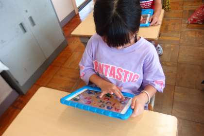 タブレットのアプリでアルファベットの学習をしているところです。