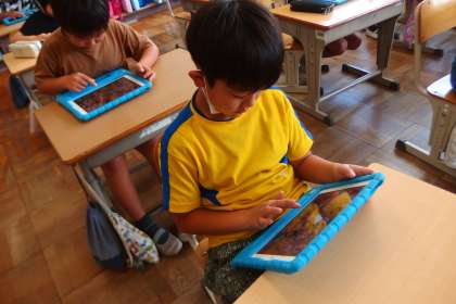 タブレットのアプリでアルファベットの学習をしているところです。