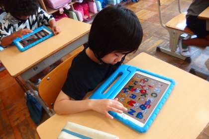 2年生の学級活動の時間です。 タブレットのアプリでアルファベットの学習をしているところです。