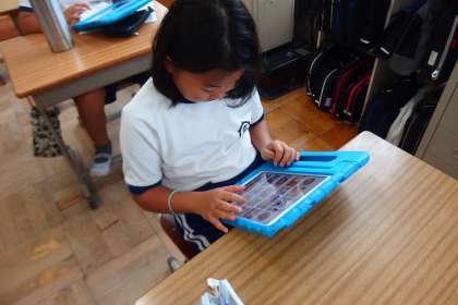 給食のメニューについてタブレットで調べている4年生です。