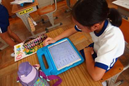 写真は4年生が校外学習の行き先についてタブレットを使って調べているところです。