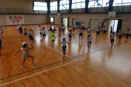 タブレットから流れる曲に合わせて、運動会の表現の練習をしています。