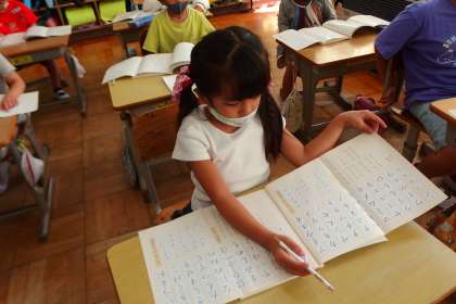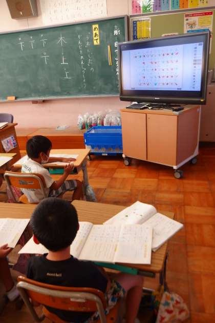 まだまだ9月分の更新が続きます。 写真は1年生の国語の授業です。 デジタル教科書で説明しています。