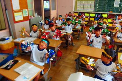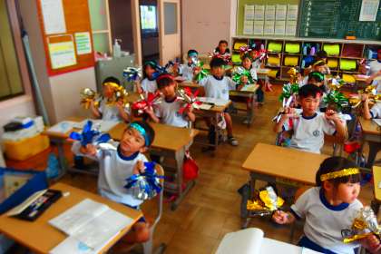 その写真の代わりにはなりませんが、1年生の教室で、キラキラ輝く小道具を思いっきり振ってもらいました。