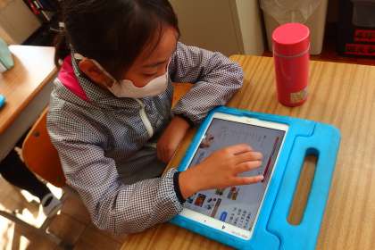 タブレットを使って給食のメニューの産地について調べている4年生です。