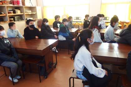 冬休み明けの全校集会をオンライン接続で行いました。 タブレットで受信、視聴しています。