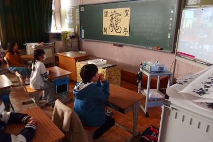 冬休み明けの全校集会をオンライン接続で行いました。 タブレットで受信、視聴しています。
