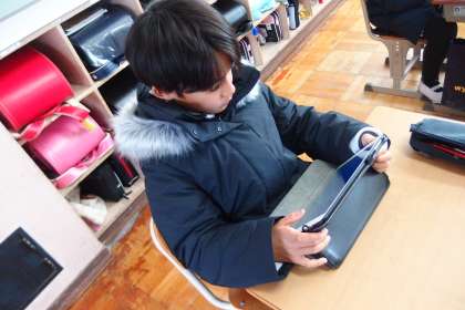 タブレットのアプリで復習をしている5年生です。