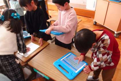 タブレットを使ってグループワークに取り組む1年生です。