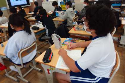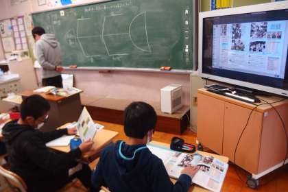 6年生の社会の授業です。 タブレットからデジタル教科書を投影しています。