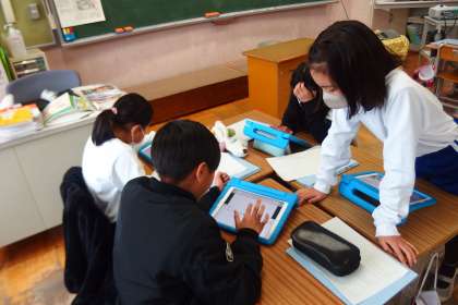 タブレットを使ってグループワークに取り組む4年生です。