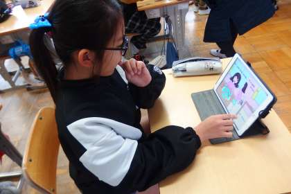 タブレットのアプリを使って復習をしている5年生です。