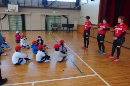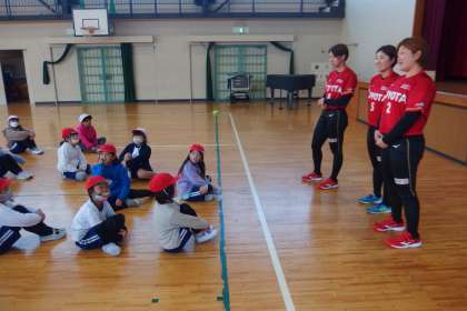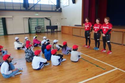 トヨタ自動車のソフトボールチーム「レッドテリア—ズ」から3人の選手をお迎えして、2年生がボールの投げ方教室を行いました。