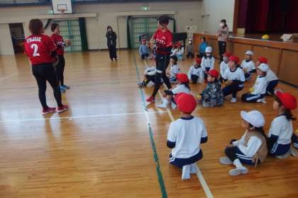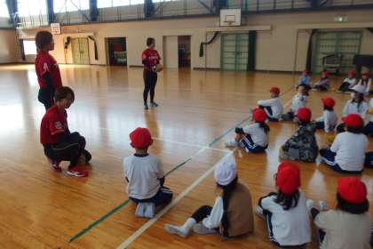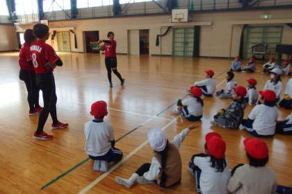 トヨタ自動車のソフトボールチーム「レッドテリア—ズ」から3人の選手をお迎えして、2年生がボールの投げ方教室を行いました。