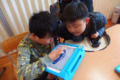 タブレットのアプリでプログラミングを学習しているところです。