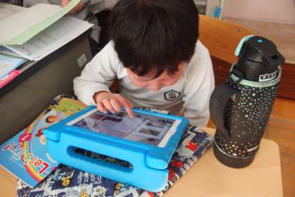 3年生の外国語活動の授業です。 形と色の表現を応用したクイズをタブレット上に作っています。