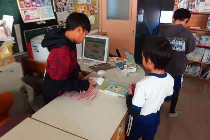 真は図書システム用のパソコンを操作して、貸し出しや返却の手続きの仕事をする図書委員です。